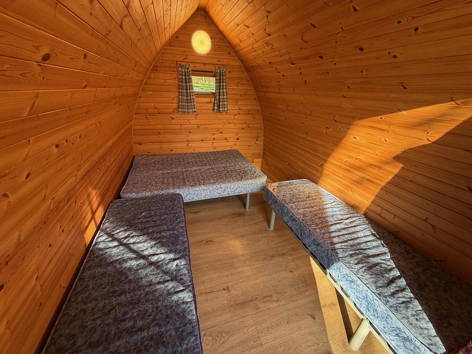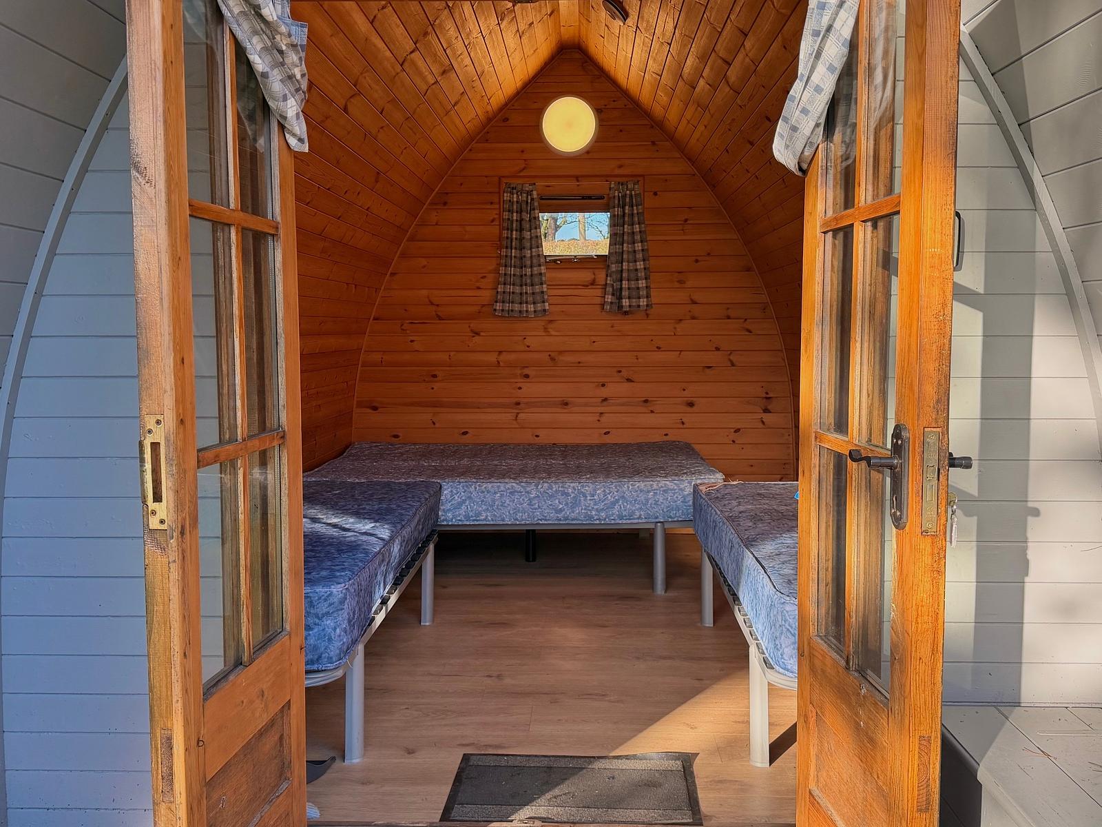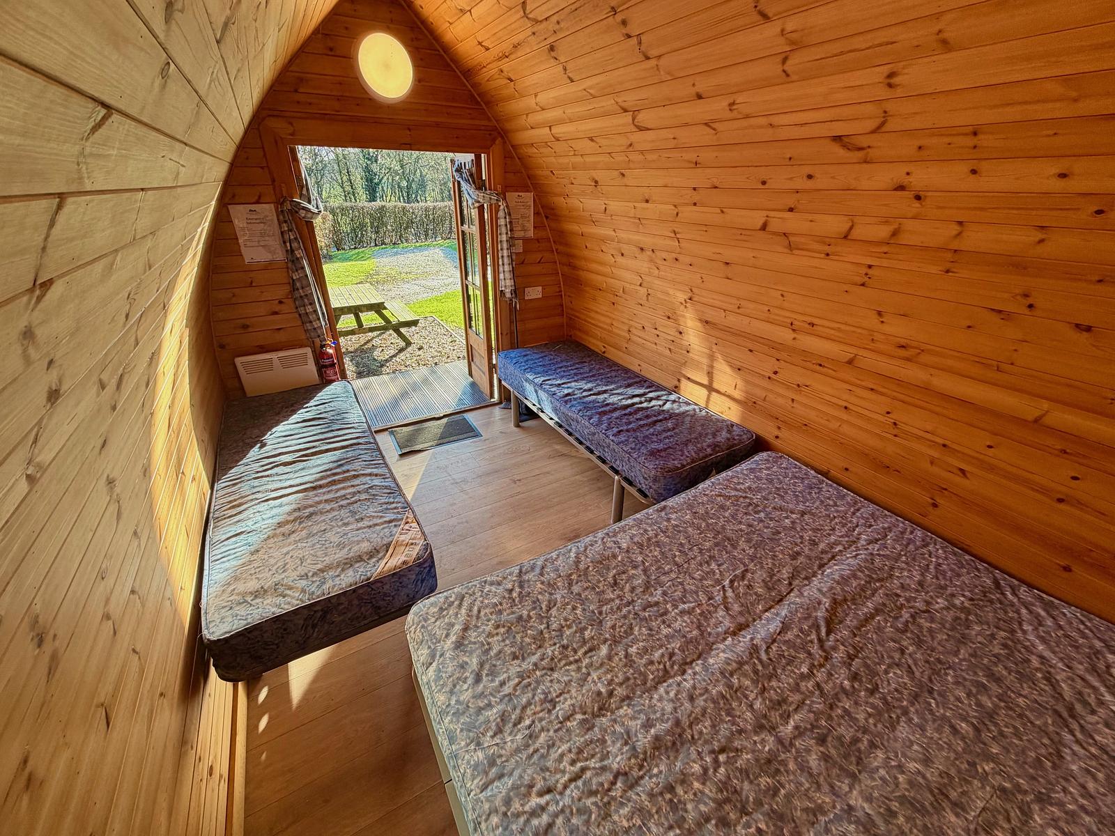 Why not add bedding to your booking? Take ‘travelling light’ even further, and have us provide your bedding (including duvets and pillows) and make the beds for your arrival for an extra charge; you can add towels to your booking, also for an additional cost. Our Camping Pods sleep up to 4 people with one double bed and two singles. They are dog-friendly, and come with a lockable door, covered porch, boot storage, picnic table, bed frames and mattresses, electric sockets, lights and heater.
